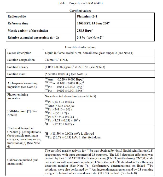 访 问 量:414SRM 4340B 钚-241放射性标准品由经过标准化和认证数量的放射性钚 241 在适当稳定和均质的基质中的溶液组成。它主要用于校准用于测量放射性和监测放射化学程序的仪器。该溶液的成分列于表 1,装在一个火焰密封的 5 mL 硼硅酸盐玻璃安瓿中(见注 1)*。