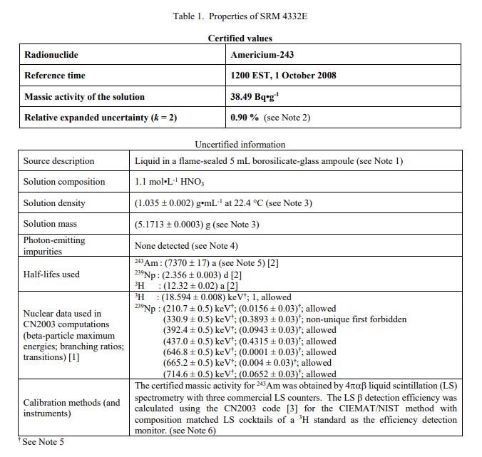 在 2008 年 10 月 1 日美国东部标准时间 1200 的参考时间,经认证的 Americium-243 质量活度值为:(38.49 ± 0.35) Bq•g-1