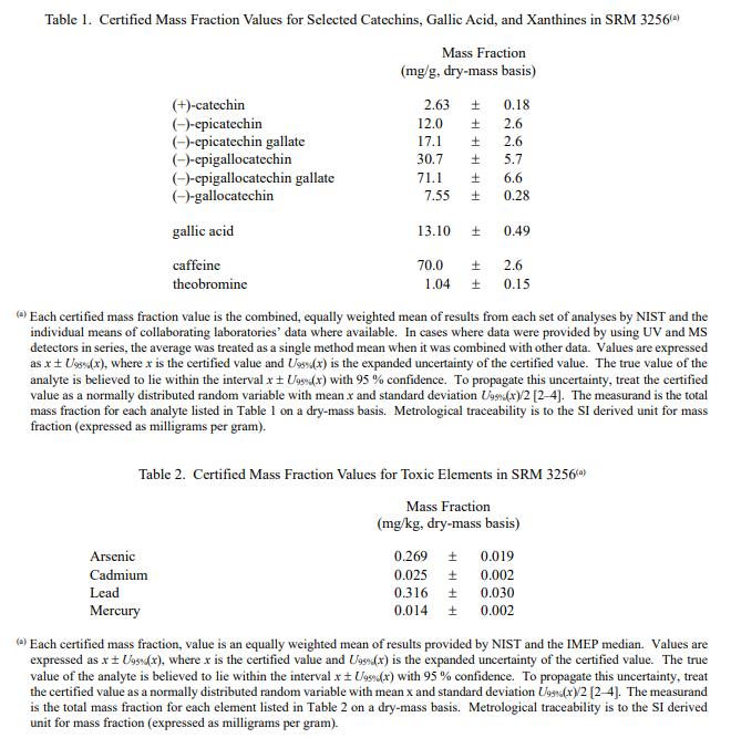 表 1 和表 2 提供了 SRM 3256 中选定的儿茶素、黄嘌.呤和元素的认证质量分数值,以干质量为基础报告。NIST 认证值是 NIST 具有最高的值对其准确性的信心,因为所有已知或可疑的偏差来源都已被调查或考虑[1]。价值分配分析由 NIST 和合作实验室进行。