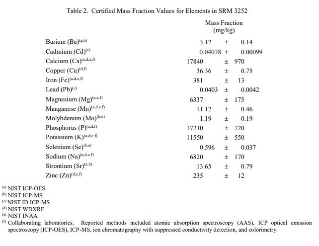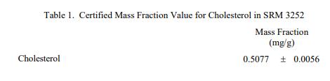 表 1 至表 3 中提供了 SRM 3252 中胆固醇、元素和维生素的认证质量分数值,以干质量为基础报告。NIST 认证值是 NIST 认证的值对其准确性的信心最高,因为所有已知或可疑的偏差和可变性来源都已考虑在内 [1]。价值分配分析由 NIST 和合作实验室进行。认证值计算为 NIST 方法的平均值和合作实验室提供的平均结果的中位数(在适当的情况下)。相关的不确定性以大约 95% 的置信水平表示 [2-4]。