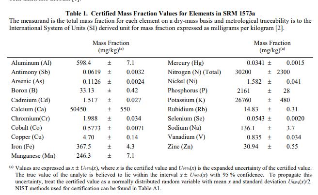 访 问 量:394SRM 1573a 番茄叶(标准品)主要用于验证测定植物材料、农产品和类似材料中主要、次要和微量元素的分析方法。在为内部控制材料分配值时,此 SRM 可用于质量保证。一个 SRM 1573a 单元由 50 克干番茄叶组成。认证的质量分数值:认证的质量分数值在表 1 中提供。 NIST 认证值是 NIST 对其准确性有最高置信度的值,因为所有已知或可疑的偏差来源都已被考虑在内